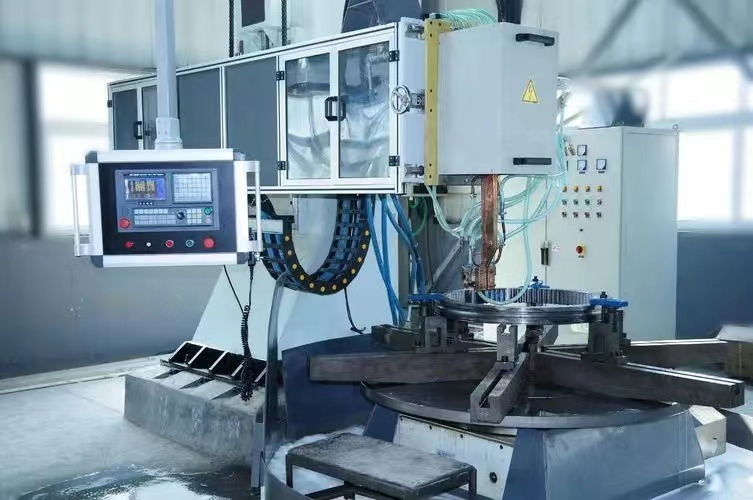 ?。?)單工位雙淬火變壓器感應(yīng)器組立式回轉(zhuǎn)支承,該回轉(zhuǎn)支承它采用一個立式升降機(jī)構(gòu),兩套淬火變壓器感應(yīng)器組.一套用以淬凸輪,另一套用以淬軸頸。兩套感應(yīng)器均是雙孔的,如網(wǎng)兩套淬火變壓器感應(yīng)器組是相互呈90。交叉,共對著回轉(zhuǎn)支承淬火機(jī)床感應(yīng)設(shè)備的雙中心線。為此.一套感應(yīng)器的兩個孔是左右配置,而另一套感應(yīng)器的二個孔呈前后分布以上兩種回轉(zhuǎn)支承淬火機(jī)床感應(yīng)設(shè)備適用于不是大批量生產(chǎn)的,因?yàn)樗遣捎冒错樞蚍侄我淮未慊鸱绞?,但對中頻電源來說,由于采用兩個工位交替加熱,其暫載率是較高的。